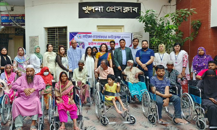 খুলনা প্রেসক্লাব চত্বরে প্রতিবন্ধীদের মাঝে হুইল চেয়ার বিতরণ