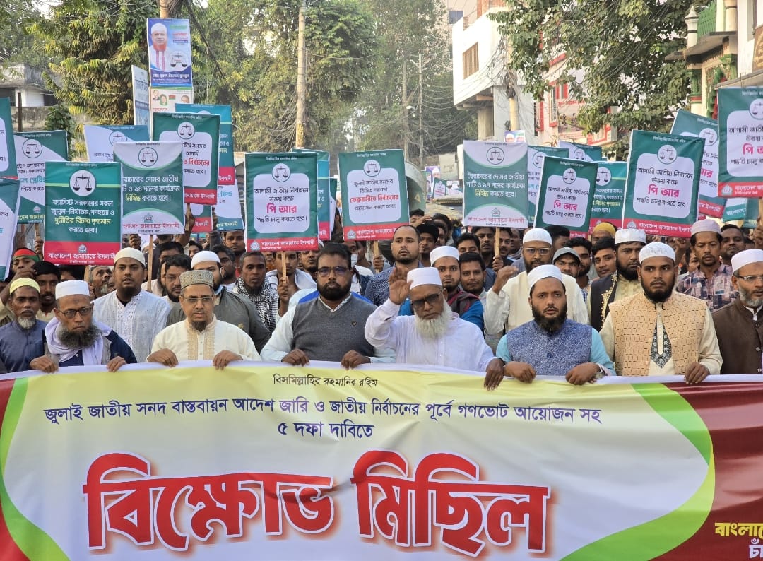 বক্তারা বলেন, জুলাই জাতীয় সনদের ভিত্তিতে ফেব্রæয়ারিতে নির্বাচন, জাতীয় নির্বাচনে পিআর পদ্ধতি চালু, লেভেল প্লেয়িং ফিল্ড নিশ্চিত করা, ফ্যাসিস্ট সরকারের জুলুম-নির্যাতন ও দুর্নীতির বিচার এবং জাতীয় পার্টিসহ ১৪ দলের কার্যক্রম নিষিদ্ধ করতে হবে। দেশ নিয়ে গভীর ষড়যন্ত্র শুরু হয়েছে। হাজারো ছাত্র-জনতার জীবনের বিনিময়ে অর্জিত জুলাই বিপ্লবকে নস্যাৎ করার দেশি-বিদেশি ষড়যন্ত্র চলছে। জনগণকে সাথে নিয়ে সকল ষড়যন্ত্র মোকাবিলা করে জাতিকে সঠিক গন্তব্যে নিয়ে যাব, ইনশাআল্লাহ। পরে বিক্ষোভ মিছিলটি বড় ইন্দারা মোড় থেকে বের হয়ে শহরের গুরুত্বপূর্ণ সড়ক প্রদক্ষিণ করে শান্তিমোড়ে গিয়ে শেষ হয়।