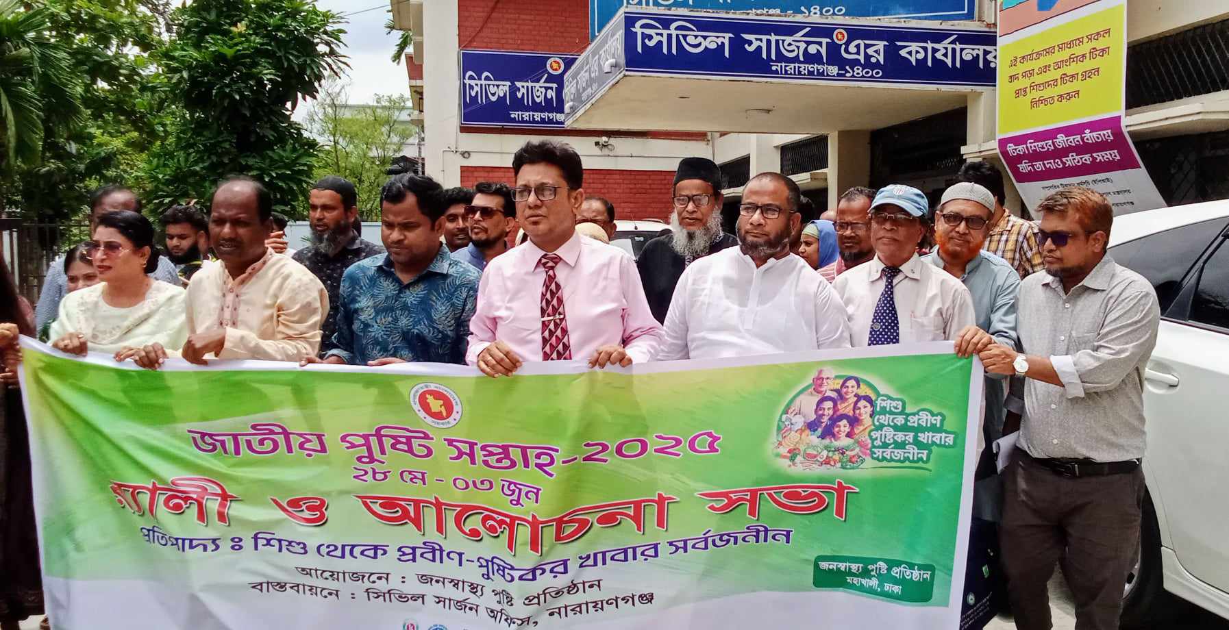 "শিশু থেকে প্রবীণ, পুষ্টিকর খাবার সার্বজনীন" এই প্রতিপাদ্য সামনে রেখে নারায়ণগঞ্জে র্যালি ও আলোচনা সভার মধ্য দিয়ে জাতীয় পুষ্টি সপ্তাহ-২০২৫ (২৮-৩ জুন) উদ্বোধন করা হয়েছে।