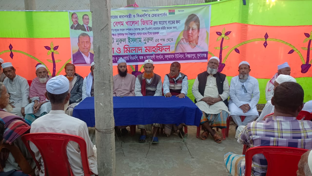 বিএনপির চেয়ারপার্সন ও তিনবারের সাবেক প্রধানমন্ত্রী বেগম খালেদা জিয়ার আশু সুস্থতা কামনায় সুনামগঞ্জের বিশ্বম্ভরপুর উপজেলার সলুকাবাদ ইউনিয়নের ভাদেরটেক বাজারে কোরআন তেলওয়াত ও দোয়া মাহফিল অনুষ্ঠিত হয়।