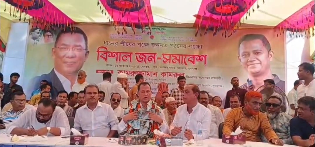 আগামী জাতীয় সংসদ নির্বাচনকে ঘিরে বিভিন্ন দলের সম্ভাব্য প্রার্থীদেও প্রচার প্রচারনা ও সভা সমাবেশে প্রার্থীরা জনগনের মনকে আকৃষ্ট করতে সুনামগঞ্জ-১(তাহিরপুর,মধ্যনগর,ধর্মপাশা ও জামালগঞ্জ) আসনে বিএনপির সম্ভাব্য ধানের শীষের মনোনয়ন প্রত্যাশী সুনামগঞ্জ জেলা বিএনপির সাবেক সাংগঠনিক সম্পাদক,বর্তমান আহবায়ক কমিটির সদস্য ও তাহিরপুর উপজেলা পরিষদের সাবেক চেয়ারম্যান কামরুজ্জামান কামরুলের সমর্থনে জনমতের লক্ষ্যে জেলার মধ্যনগর বাজারে এক জনসভা অনুষ্ঠিত হয়েছে।
