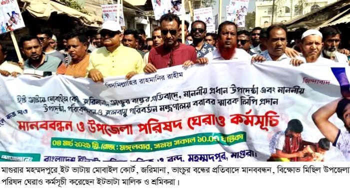 মাগুরার মহম্মদপুরে বিক্ষোভ মিছিল, মানববন্ধন ও উপজেলা পরিষদ ঘেরাও কর্মসূচি করেছেন ইটভাটার মালিক ও শ্রমিকরা। তাদের দাবী ইটভাটায় মোবাইল কোর্ট, জরিমানা ও ভাঙচুর করা যাবে না, তার প্রতিবাদে মঙ্গলবার (৪