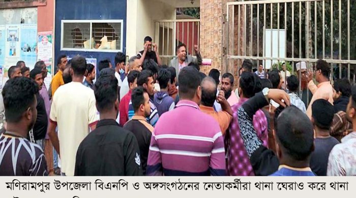 মণিরামপুর উপজেলা বিএনপি ও অঙ্গসংগঠনের নেতাকর্মীরা থানা ঘেরাও করে থানা ফটকের সামনে বিক্ষোভ সমাবেশ করেছে। বিগত সরকারের আমলে থানায় ধরে এনে শত শত বিএনপির নেতাকর্মীদের মিথ্যা মামলায় জেলহাজতে পাঠানো হতো।