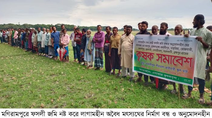 মণিরামপুরে অবৈধ মৎস্যঘের নির্মাণ বন্ধের দাবীতে কৃষক সমাবেশ অনুষ্ঠিত হয়েছে। ‘জাগো কৃষক, বাঁচাও দেশ’ এ শ্লোগান কে সামনে নিয়ে স্থানীয় কৃষকদের আয়োজনে যশোরের মণিরামপুরে প্রায় ১০/১২টি গ্রামের কৃষকরা এ সমাবেশে