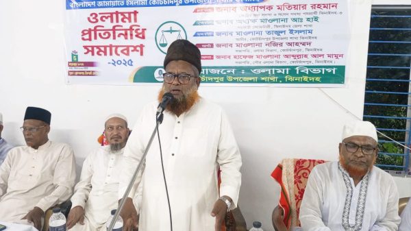 মোঃ জাহাঙ্গীর আলম, কোটচাঁদপুর সংবাদদাতা ঝিনাইদহ: ঝিনাইদহের কোটচাঁদপুরে বাংলাদেশ জামায়াতে ইসলামীর উপজেলা শাখার উদ্যোগে ওলামা প্রতিনিধি সমাবেশ অনুষ্ঠিত হয়েছে। বুধবার (৫ নভেম্বর) বিকেলে উপজেলা সভাপতি মাওলানা নাজির আহমেদ