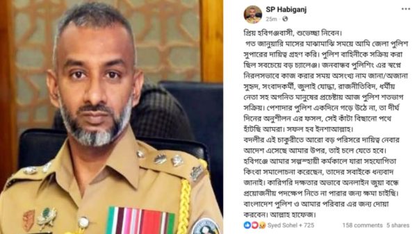 শাহাদাত কামাল শাকিল….. হবিগঞ্জ জেলা পুলিশ সুপার (এসপি) এ এন এম সাজিদুর রহমান বদলি হয়ে নতুন কর্মস্থলে যোগ দিতে যাচ্ছেন। বিদায়বার্তায় তিনি জনবান্ধব পুলিশিং বাস্তবায়নে জনগণের সহযোগিতার কথা স্মরণ করলেও
