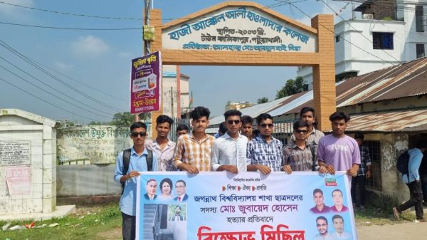 সাকিব হোসেন পটুয়াখালী জেলা প্রতিনিধিঃ- জগন্নাথ বিশ্ববিদ্যালয় (জবি) শাখা ছাত্রদলের সদস্য মোঃ জুবায়েদ হোসেনকে নৃশংসভাবে হত্যার প্রতিবাদে পটুয়াখালীর হাজী আক্কেল আলী হাওলাদার ডিগ্রি কলেজ ছাত্রদল বিক্ষোভ মিছিল ও সমাবেশ করেছে।