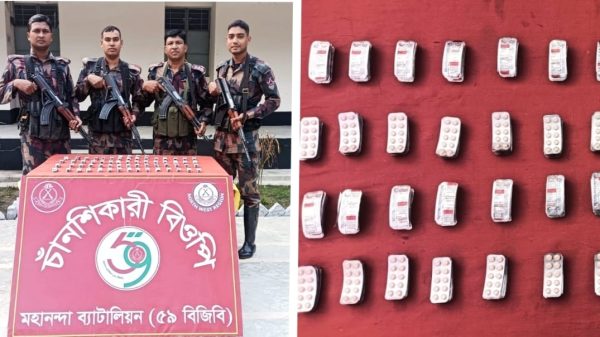 মাহিদুল ইসলাম ফরহাদ চাঁপাইনবাবগঞ্জ জেলা প্রতিনিধি চাঁপাইনবাবগঞ্জ ভোলাহাট সীমান্তে (২৩ নভেম্বর) মধ্যরাত ০১:২০ ঘটিকায় মহানন্দা ব্যাটালিয়ন (৫৯ বিজিবি) এর অধীনস্থ চাঁনশিকারী বিওপি’র ০১টি বিশেষ টহল দল সীমান্ত পিলার ১৯৬/৫-এস হতে